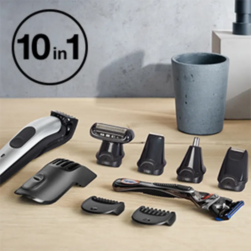 The Braun MGK 7220 10-in-1 trimmer for men is the ultimate all-in-one styling kit, helping you achieve 10 jobs with 1 device. Maintain stubble, short, medium or long beards, contour edges, clean shave, precision trim, precision shave, clip hair, groom body hair, trim ear and nose hair.