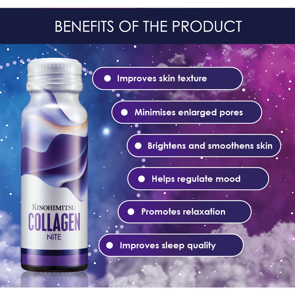 Kinohimitsu Collagen Nite Drink is an upgraded version of the Collagen Diamond Nite, a new formula with 2 new ingredients. Spinach & Green Tea Extract & L-Tryptophan. It contains formula that works to relax and bounce back stressful skin just over 8 hours of beauty sleep! As soon as in 6* days, skin becomes smoother and pores are less visible. Containing 5300mg of finest marine collagen peptide, its molecule size is small for immediate absorption.