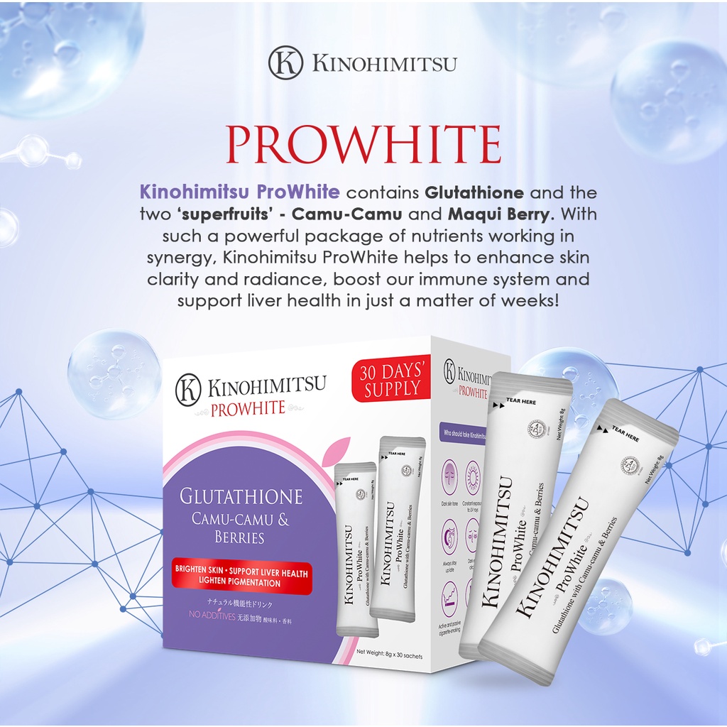 Kinohimitsu ProWhite is a delicious functional drink that provides systemic health and beauty functions. It contains Glutathione and two superfruits- Camu-Camu and Maqui Berry that eliminate spots and reduce oxidative stress. With such a powerful package of nutrients working in synergy, Kinohimitsu ProWhite helps to enhance skin clarity and radiance, boost up immune system and promote healthy liver for perfectly flawless and glowing skin in just matter of weeks!