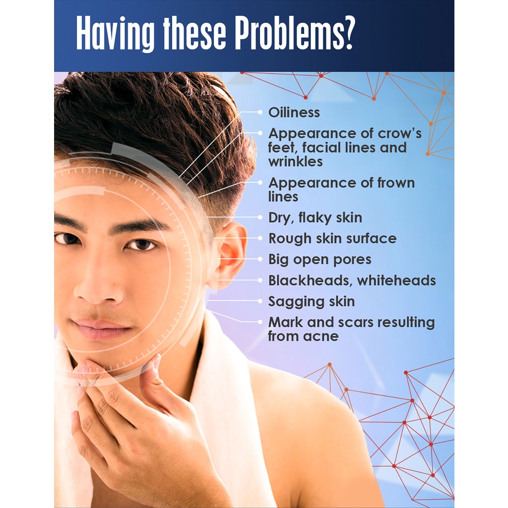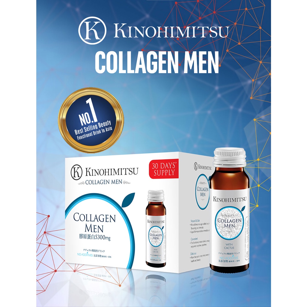 Kinohimitsu Collagen Men is a functional, instant drink specifically designed for men that combats against oiliness, dehydrated skin, acnes/ blemishes, blackheads/whiteheads and wrinkles that are commonly faced by men today. With its high concentration of Collagen Peptide and moisturizing agents such as Hyaluronic Acid, Cactus Extract and Aloe Vera, you can achieve clearer, smoother and younger looking skin in just 6 days*!