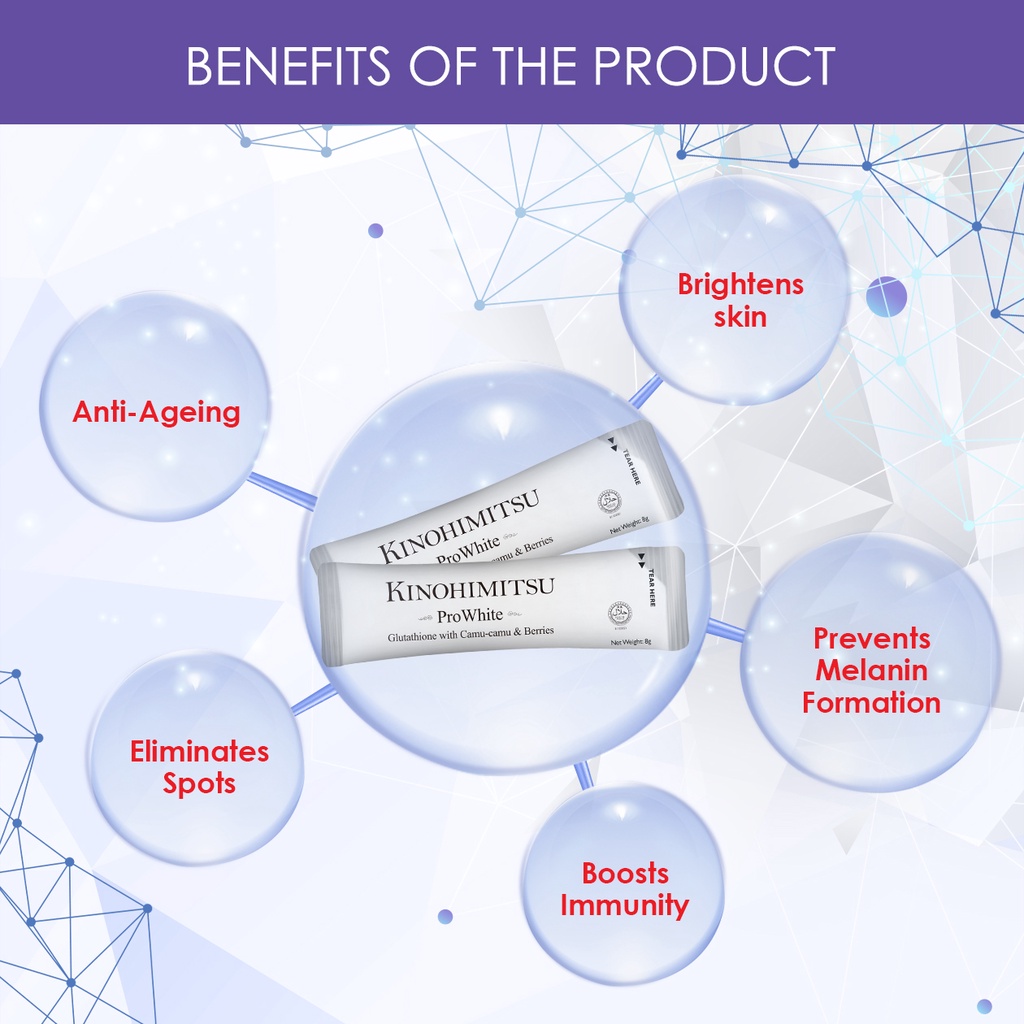 Kinohimitsu ProWhite is a delicious functional drink that provides systemic health and beauty functions. It contains Glutathione and two superfruits- Camu-Camu and Maqui Berry that eliminate spots and reduce oxidative stress. With such a powerful package of nutrients working in synergy, Kinohimitsu ProWhite helps to enhance skin clarity and radiance, boost up immune system and promote healthy liver for perfectly flawless and glowing skin in just matter of weeks!