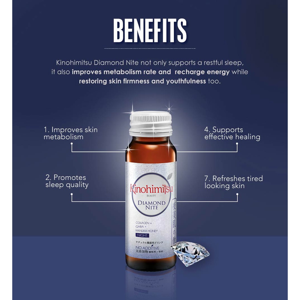 Kinohimitsu Collagen Nite Drink is an upgraded version of the Collagen Diamond Nite, a new formula with 2 new ingredients. Spinach & Green Tea Extract & L-Tryptophan. It contains formula that works to relax and bounce back stressful skin just over 8 hours of beauty sleep! As soon as in 6* days, skin becomes smoother and pores are less visible. Containing 5300mg of finest marine collagen peptide, its molecule size is small for immediate absorption.