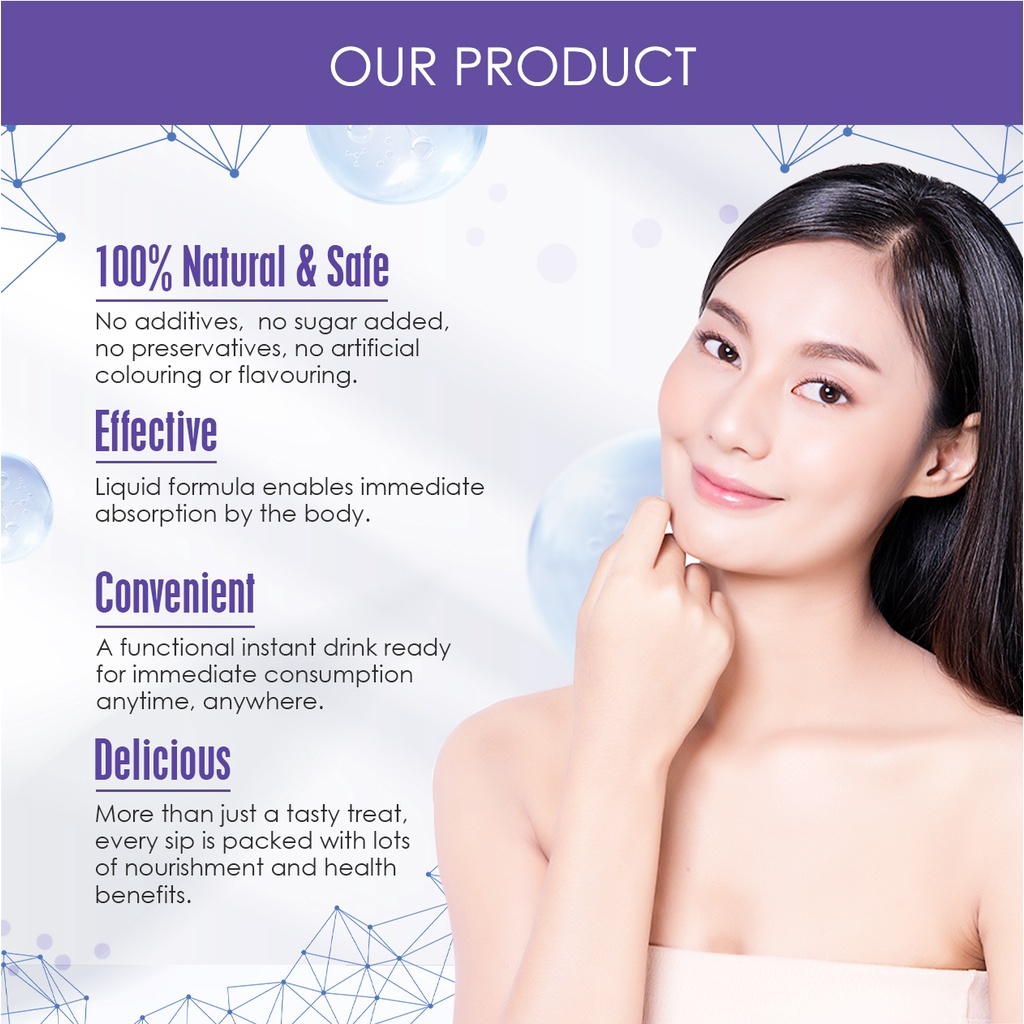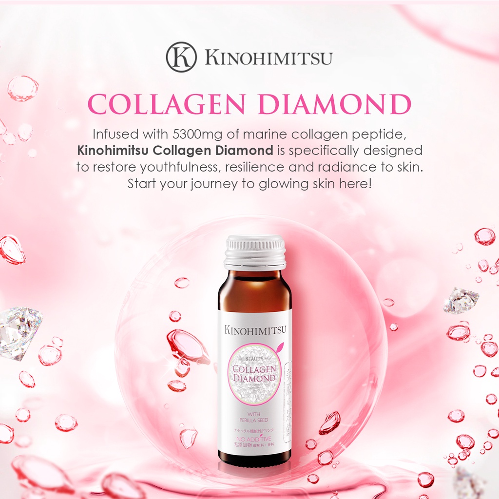 Infused with 5300mg of Collagen Peptide, Kinohimitsu Collagen Diamond 5300 Drink is specifically designed for mature skin to restore youthful, resilience and radiant skin. Collagen Peptide has shorter molecular structure and is almost similar to the structure of collagen in our skin and thus it is easily absorbed and utilised by our skin. By actively boosting collagen synthesis and repairing damaged collagen fibres, Kinohimitsu Collagen Diamond 5300 Drink reduces signs of ageing such as fine lines, wrinkles and dryness. Feel the visibly lifted and moisture plumped skin yourself with Kinohimitsu Collagen Diamond 5300 Drink!