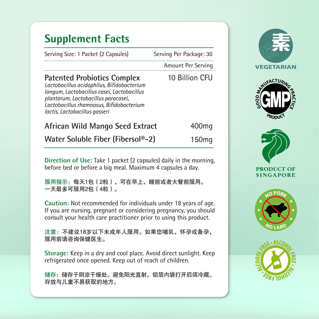 10 Billion Patented Probiotics Complex (Lactobacillus Acidophilus, Bifidobacterium Longum, Lactobacillus Casei, Lactobacillus Plantarum, Lactobacillus Paracasei, Lactobacillus Rhamnosus, Bifidobacterium Lactis, Bifidobacterium Gasseri), African Wild Mango Seed Extract, Water Soluble Fiber