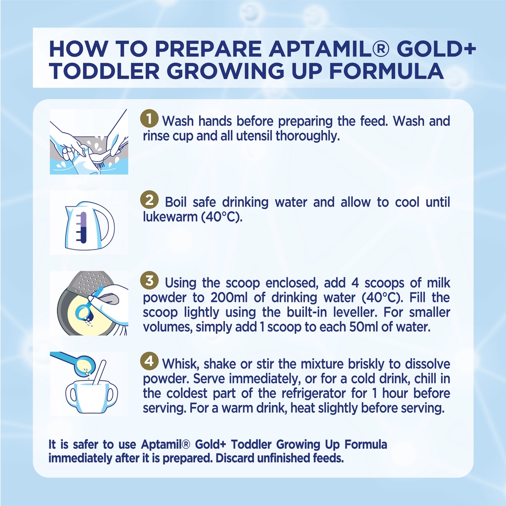 Aptamil Gold+ Toddler Growing Up Formula immediately after it is prepared. Discard unfinished drinks.