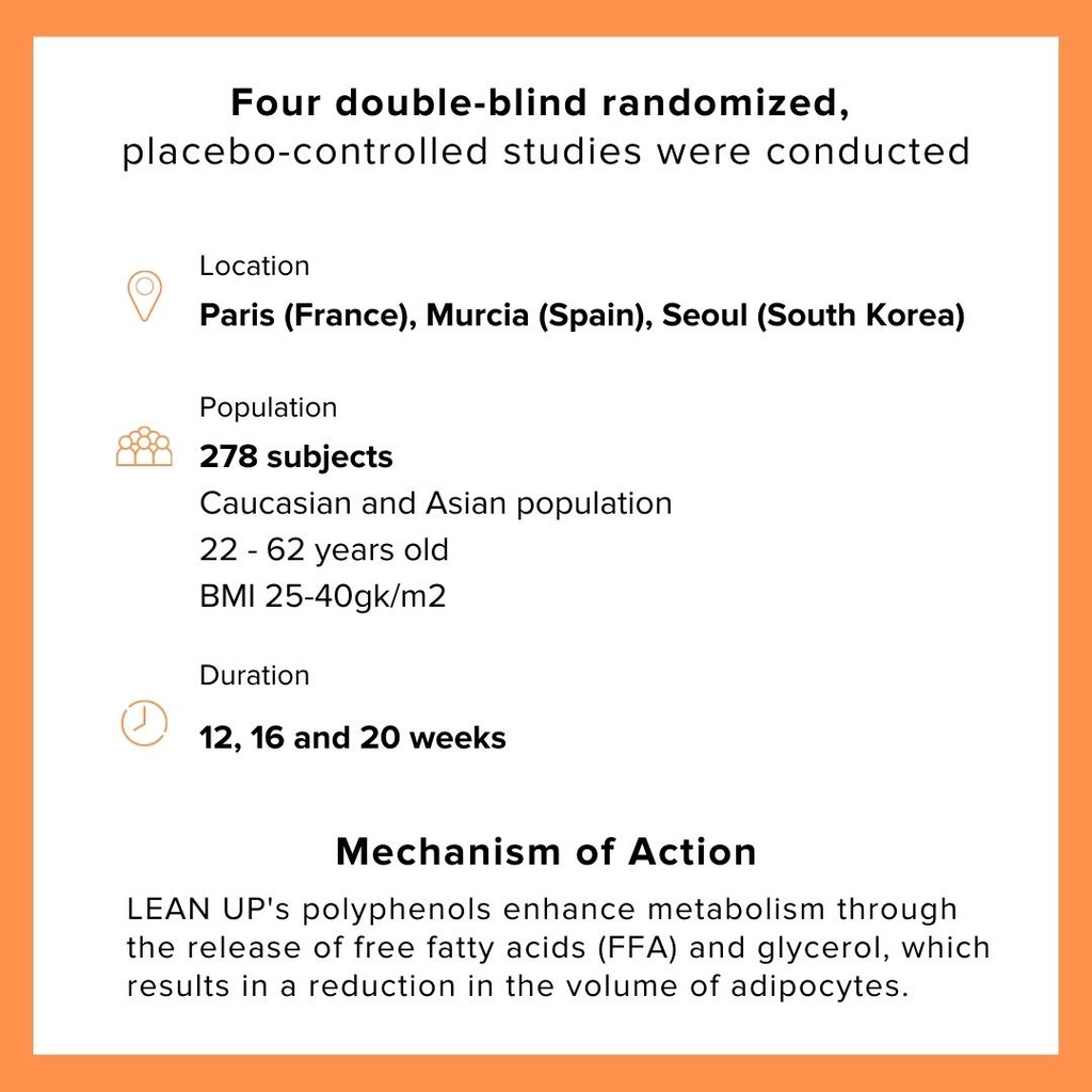 With results from more than 190 subjects over 16 weeks, LEAN UP works as a proven, safe, and natural fat shredder. A 1-month follow-up study concludes that subjects continue to experience higher resting energy expenditure of 180kcal.