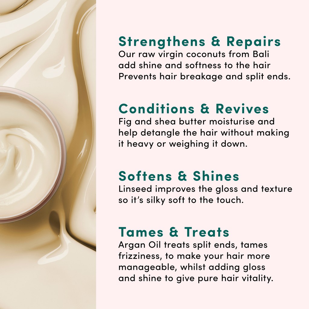 A highly concentrated deep conditioning hair treatment that works to improve the health of your hair. Infused with coconut, fig, shea butter, linseed and argan oil to strengthen and restore hair to its pure virgin state...so it’s “Like a Virgin”...again! Our super-charged formula delivers hydration from root to tip, repairing hair damaged by heat, styling, dyes and the environment. Improves hair texture by targeting frizz, preventing split ends and adding gloss.