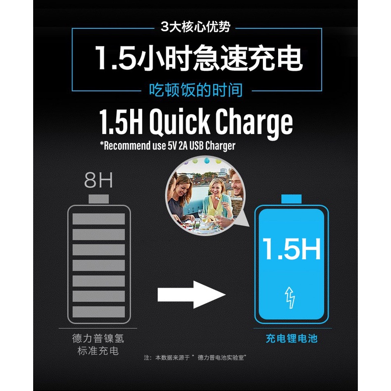 8. 1.5v Li-ion charger can only charge 1.5v Li-ion batteries. No other types of batteries and vice versa. However, Delipow cannot guarantee the quality, safety, compatibility, or performance of other battery brands. To ensure the best optimization, using Delipow set solely is recommended. We will not be responsible for any incompatible 3rd party brand charger/battery used.