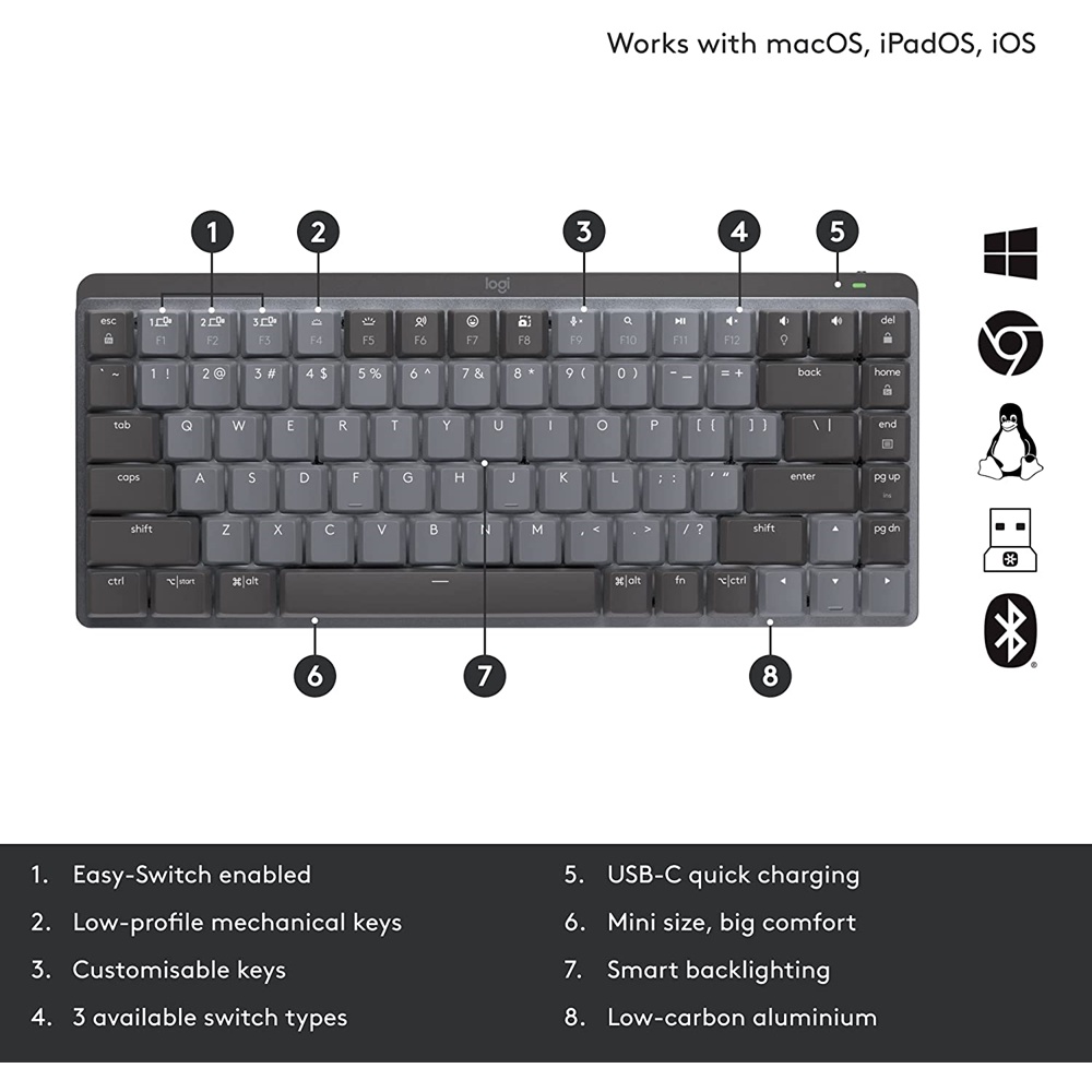 Both mechanical keyboards are compatible with all major operating systems right out of the box2. Easily pair and switch between up to three devices with a tap of a button via Bluetooth Low Energy or the included Logi Bolt USB Receiver.