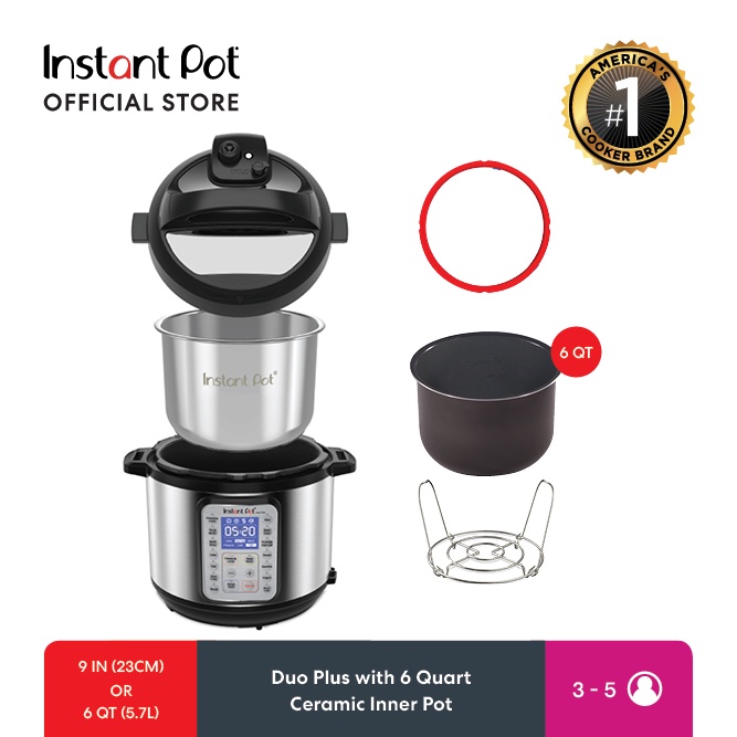 What's In the Box: Duo Plus Unit with 6QT Ceramic Inner Pot, Easy Seal Lid (w/ Clear Sealing Ring Affixed), Stainless Steel Inner Pot, Steam rack with Handles, 1 Extra Red Sealing Ring, and E-recipe booklet