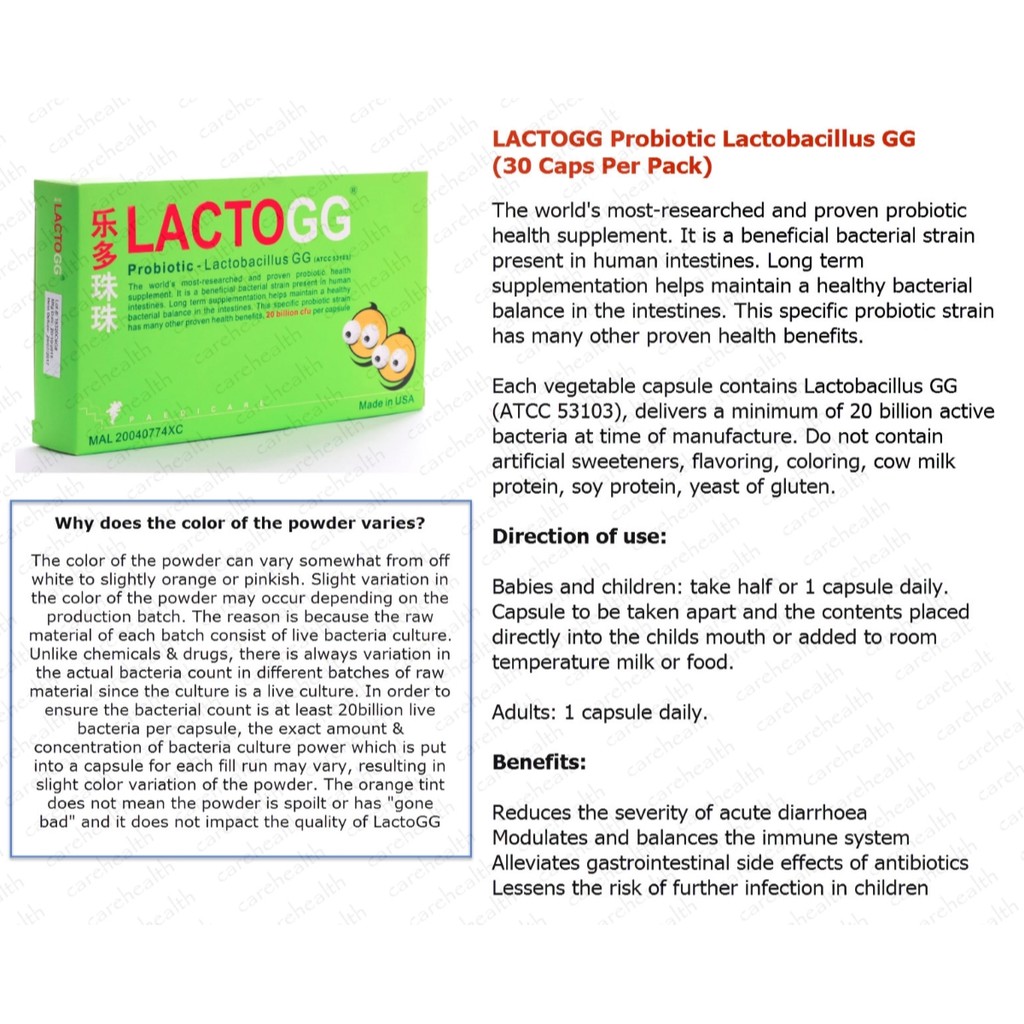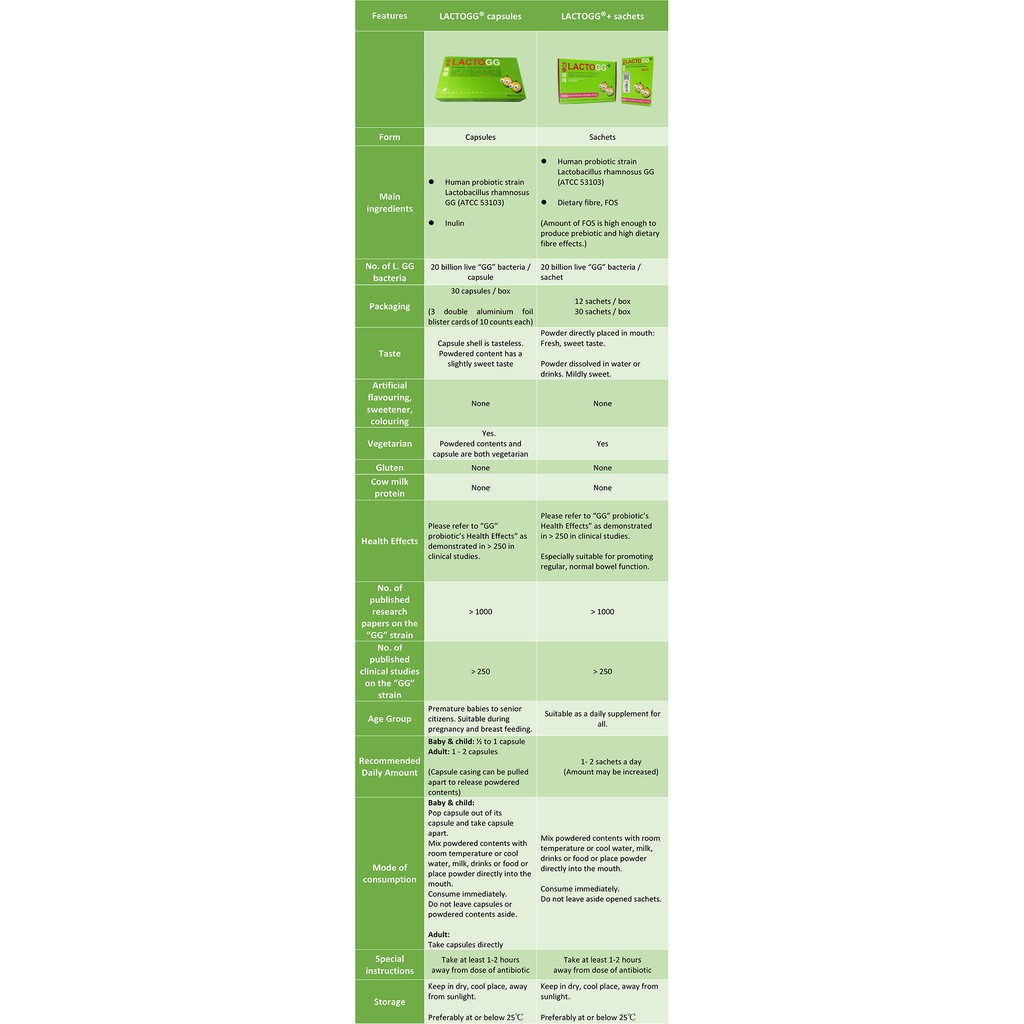 Each sachet / capsule of LACTOGG®+ contains at least 20 billion live GG probiotic bacteria and the natural dietary fibre called fructooligosaccharide. Each capsule of LACTOGG® contains a minimum of 20 billion live GG bacteria.