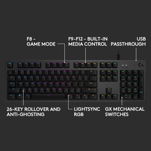 Media and lighting controls are right at your fingertips. Use FN + F keys to control volume, play and pause, skip track, mute, toggle lighting, enter game mode, etc. Use the FN toggle feature in Logitech Gaming Software (LGS) to configure F keys to perform media commands by default.1