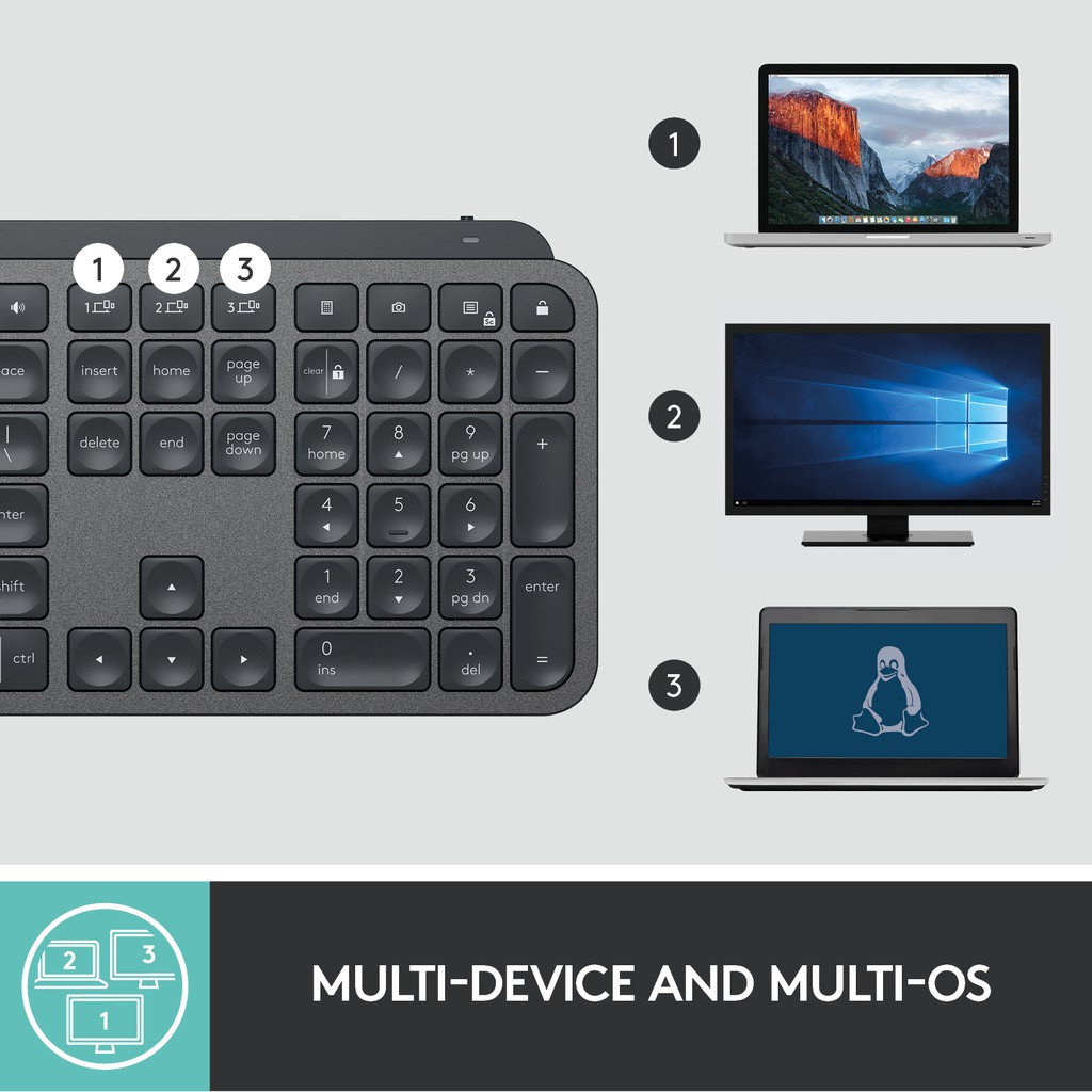 Introducing MX Keys, an advanced wireless illuminated keyboard crafted for efficiency, stability, and precision. Perfect Stroke keys are shaped for your fingertips and increased key stability reduces noise while optimizing responsiveness. Tactile reference for hand positioning makes it easy to stay oriented and in your flow. The backlit keys light up the moment your hands approach, and automatically adjust to suit changing lighting conditions. MX Keys follows your MX Master 3 – or other Flow-enabled mouse – from one computer to another, meaning you can type on multiple devices in one fluid workflow (2). With MX Keys you can truly master what you make.