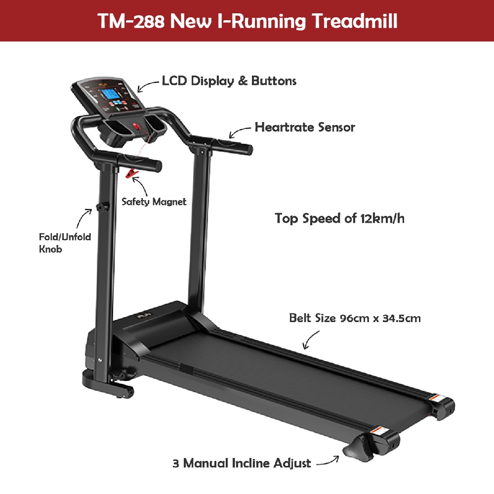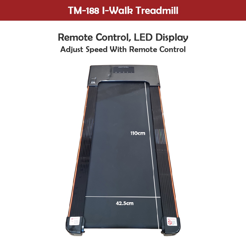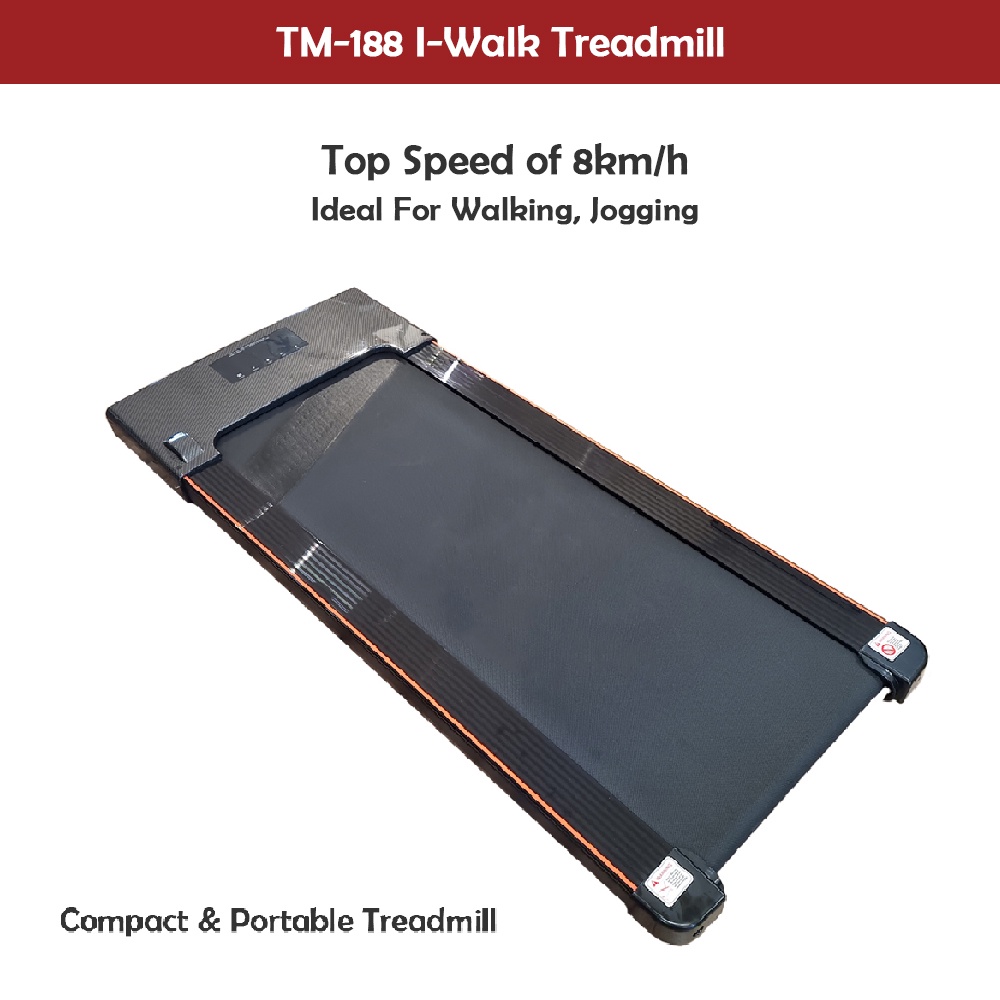 This TM-188 iWalk treadmill is a cost-effective and space-efficient way to exercise daily, offering a wide range of speed up of to 8km/h. Simple in design but with its powerful 0.65 HP motor, it gives you the functions you need to get fit indoors. The LED display shows distance, speed, time and calories burnt – making it easy to stay on track throughout your workout. It has a running surface area of 110cm by 42.5cm and can be easily stored away when not in use.
