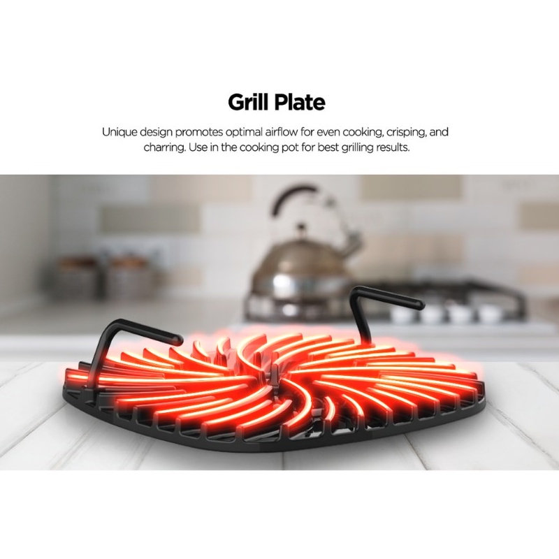The non-stick ceramic-coated grillgrate, crisper basket, and cooking pot are all easy to clean and dishwasher safe.