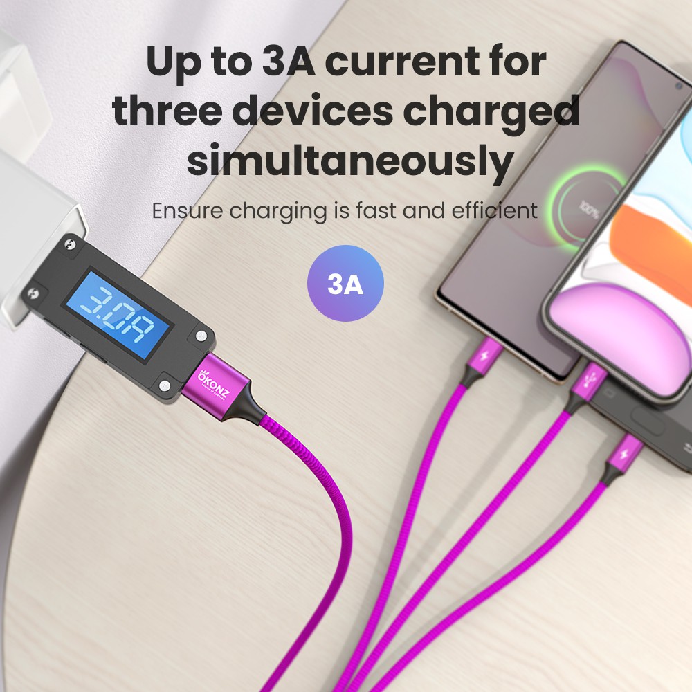 • OKONZ 3A 3 in 1 Fast Charge Cable - Supports up to 3A charging for multiple phone connection, and data transfer on the IOS.
