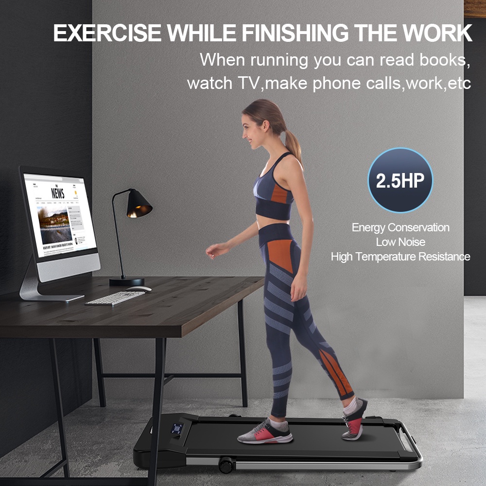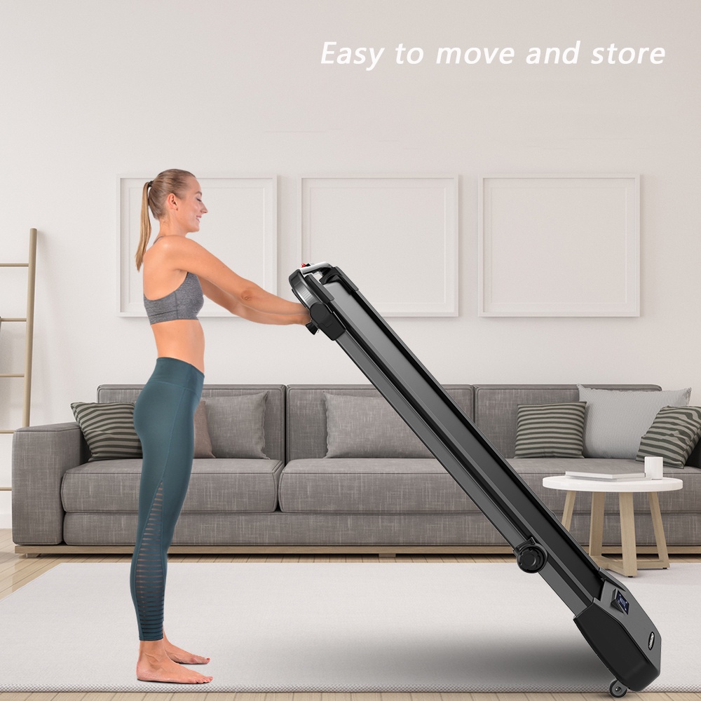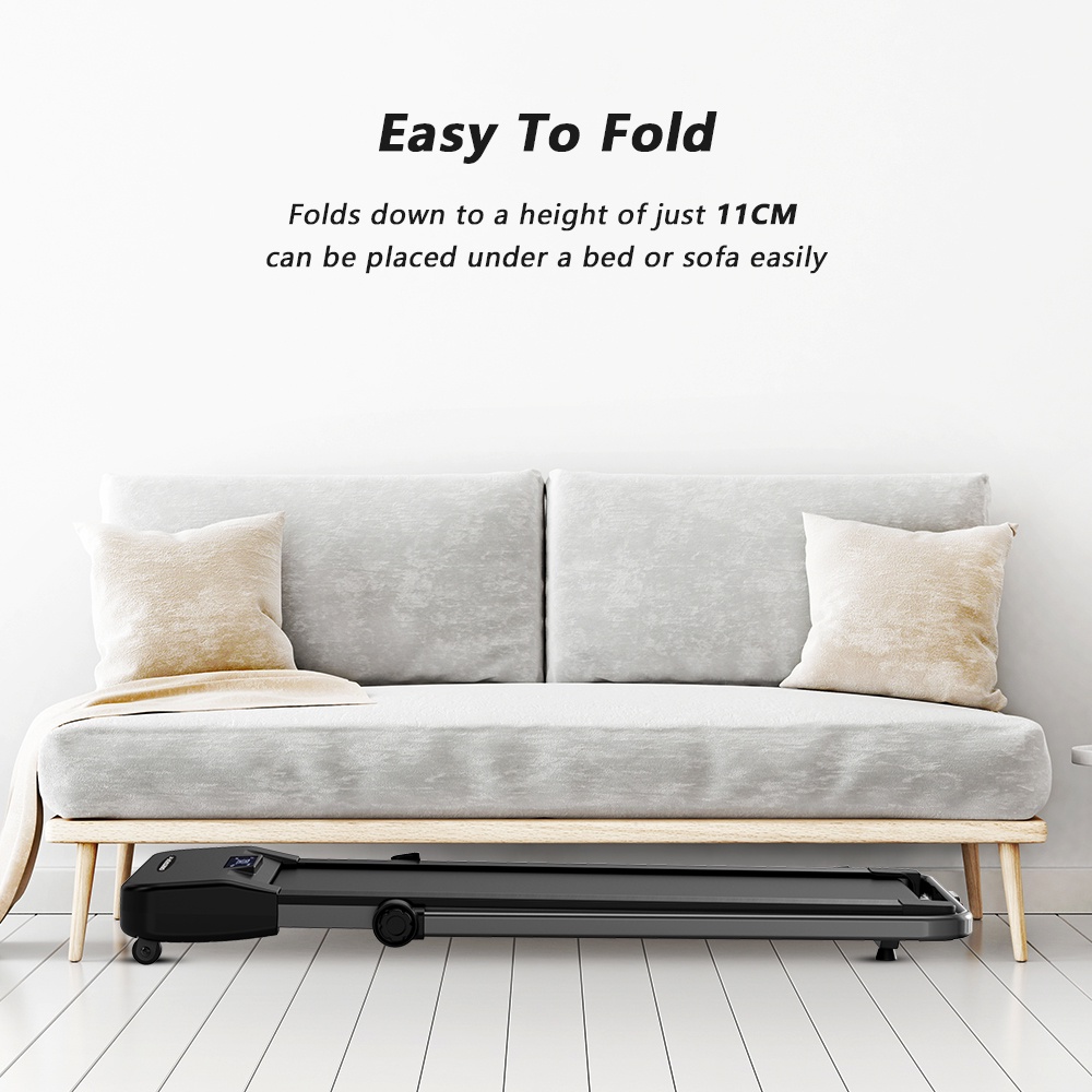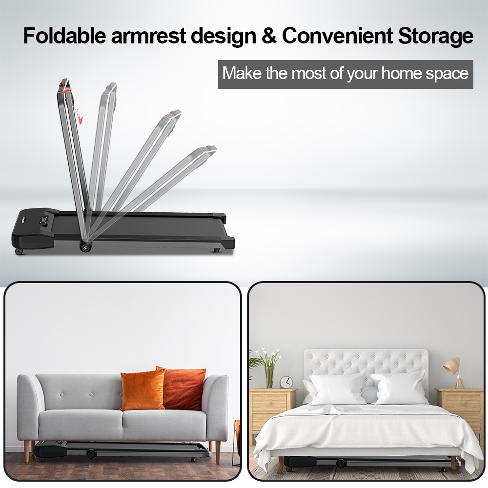 【2 IN 1 FOLDABLE TREADMILL】:This 2-in-1 under desk treadmill has 2 modes: Running mode and Walking mode. In running mode, the speed is 0.8-12km/h. In walking mode, the speed is 0.8-10km/h controlled by the Remote when folded. It is convenient to change the mode and do the exercise you want.