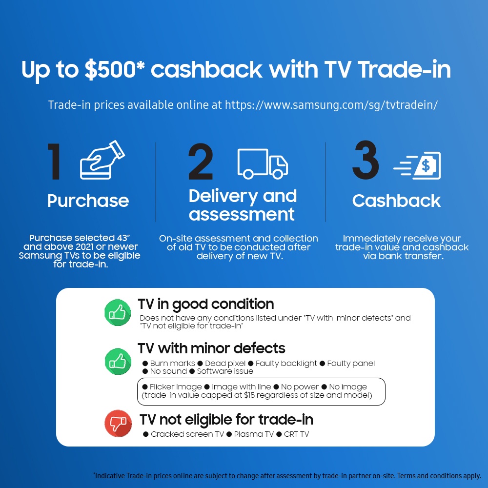 - TV trade-in: Refer to this website for more details https://www.samsung.com/sg/tvtradein/