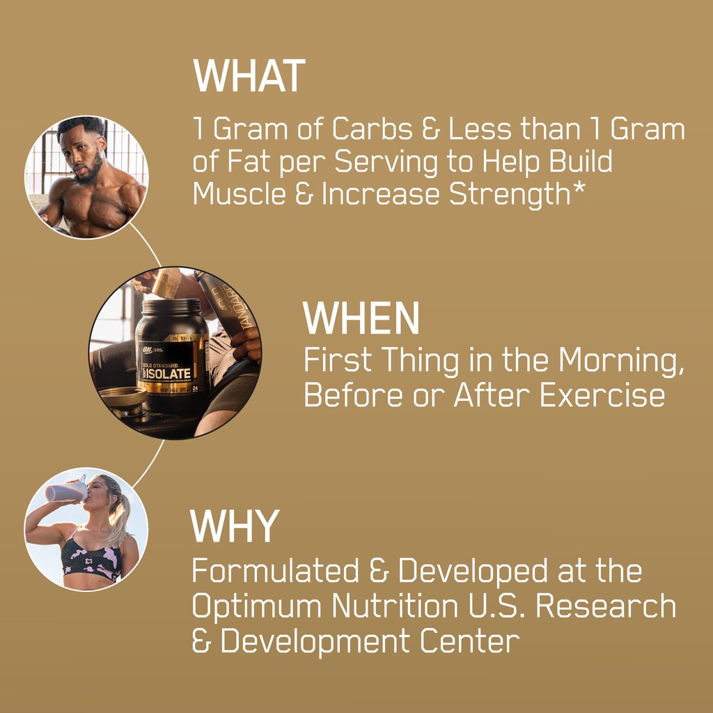To create GOLD STANDARD 100% ISOLATE, we start by selecting only the highest quality whey protein which undergoes a series of sophisticated filtration processes to ‘isolate’ out excess fat, cholesterol and sugar. A portion of this Whey Protein Isolate is then hydrolyzed – broken down into smaller chains of amino acids. The final product is a fast digesting complete protein containing no more than 1 gram of carbohydrates, less than a gram of fat and more than 80% pure protein per Serving.