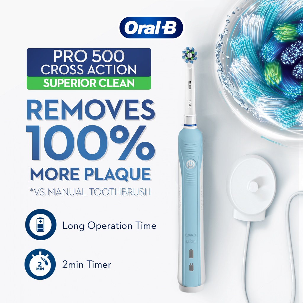 The Oral-B PRO 500 rechargeable electric toothbrush provides a clinically superior clean versus a regular manual toothbrush.