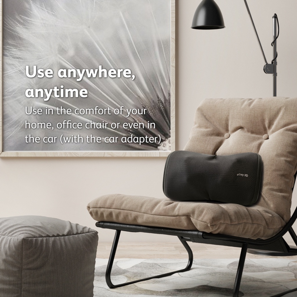 The portable uCozy 3D neck and shoulders massager can be used in the comfort of your home, on your office chair or even in the car (with the car adapter).