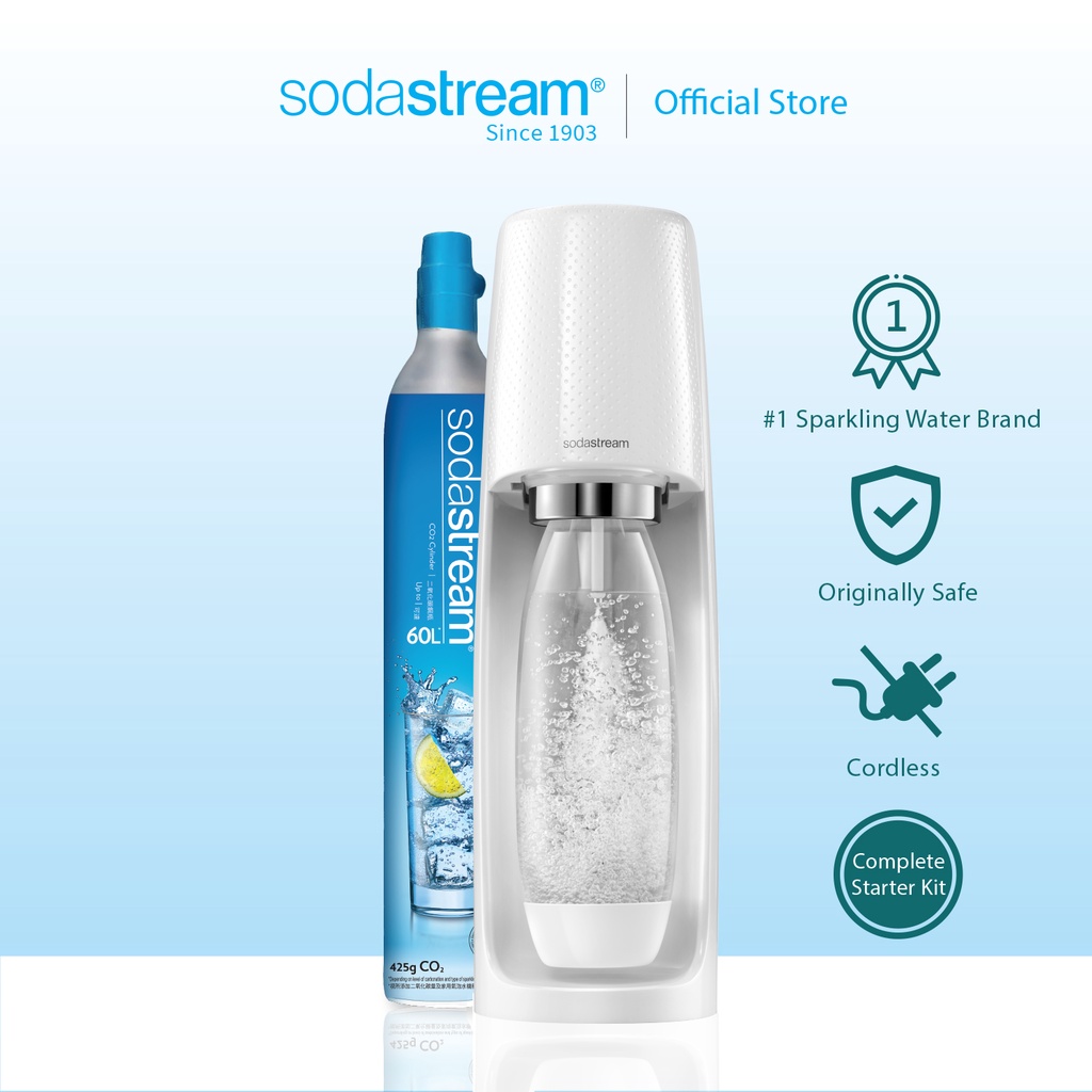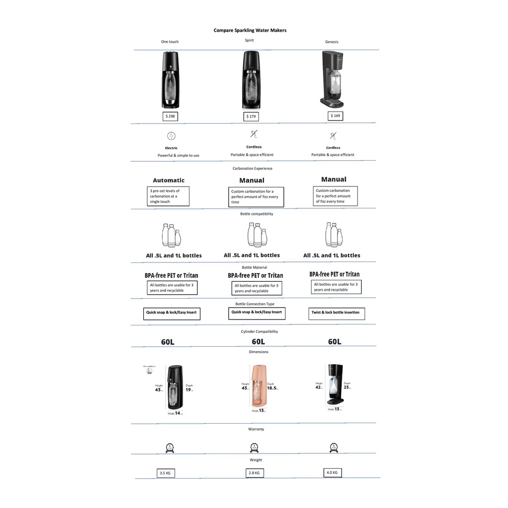 The Spirit Sparkling Water Maker turns water into sparkling water in seconds and is designed to capture the essence of SodaStream’s original machines while incorporating a new slimmer design to fit beautifully in any modern kitchen. This is a manual model without the need for batteries nor electrical cord. Well loved for its mobility to bring to any outdoor places! All you need is water!