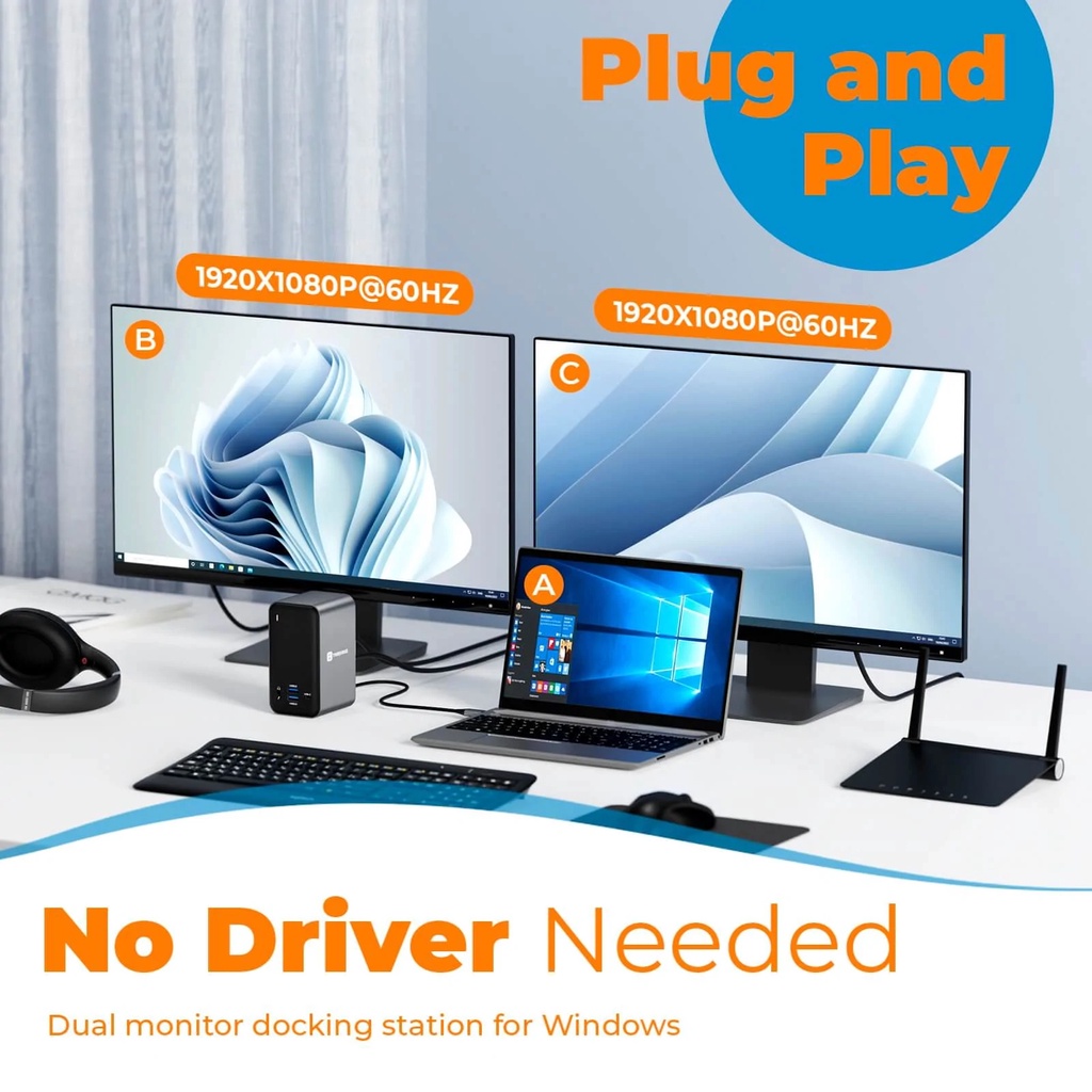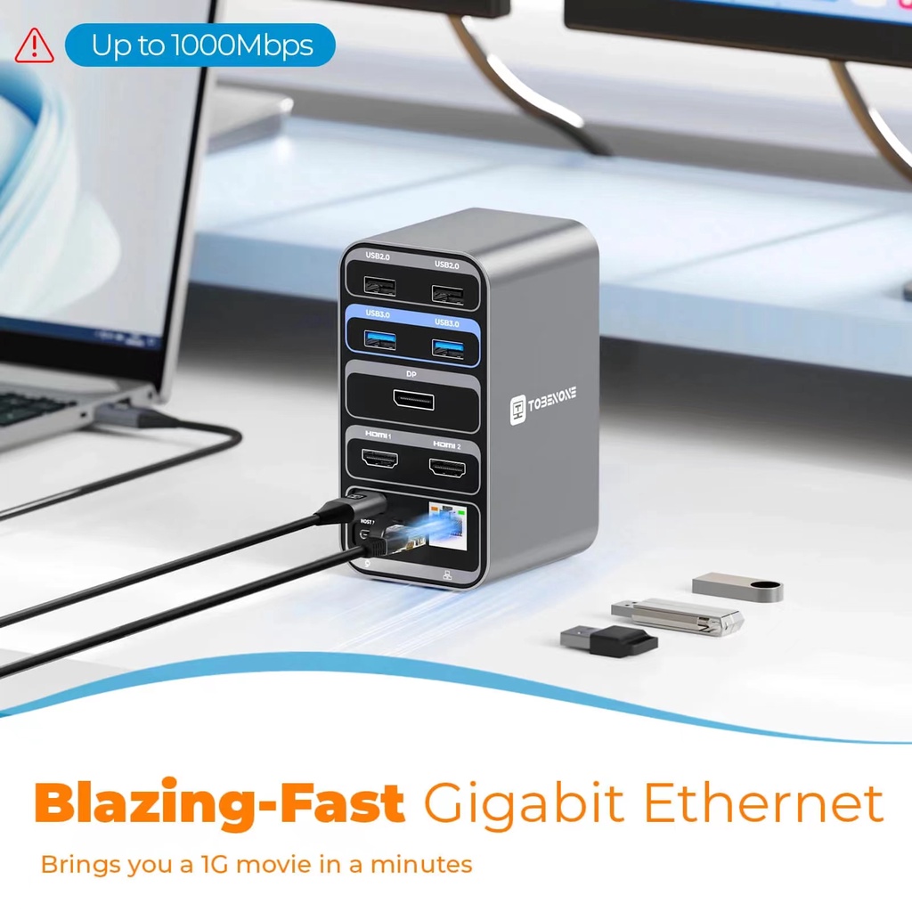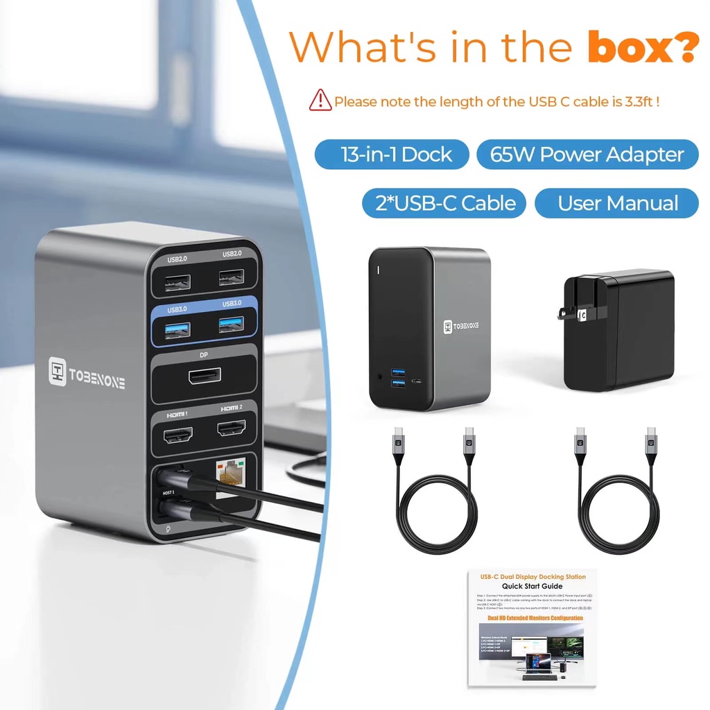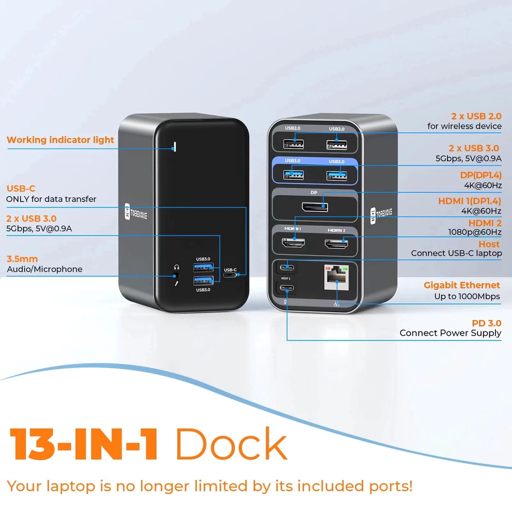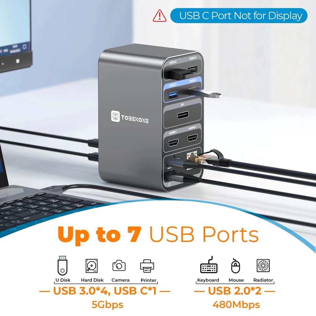 13-in-1 USB C Dock: With the Tobenone USB C Dock for Windows Laptops, your laptop is no longer limited by the ports it comes with. With a single USB C cable, this universal docking station can expand your Windows laptop to 13 ports(2 x HDMI, 1 x DP, 6 USB, 1 x USB C, 1 x PD Type-C and 1 x Gigabit Ethernet, 1 x 3.5mm Audio/Mic). You can easily increase your productivity with this USB-C dock. Note that this docking station is plug and play.