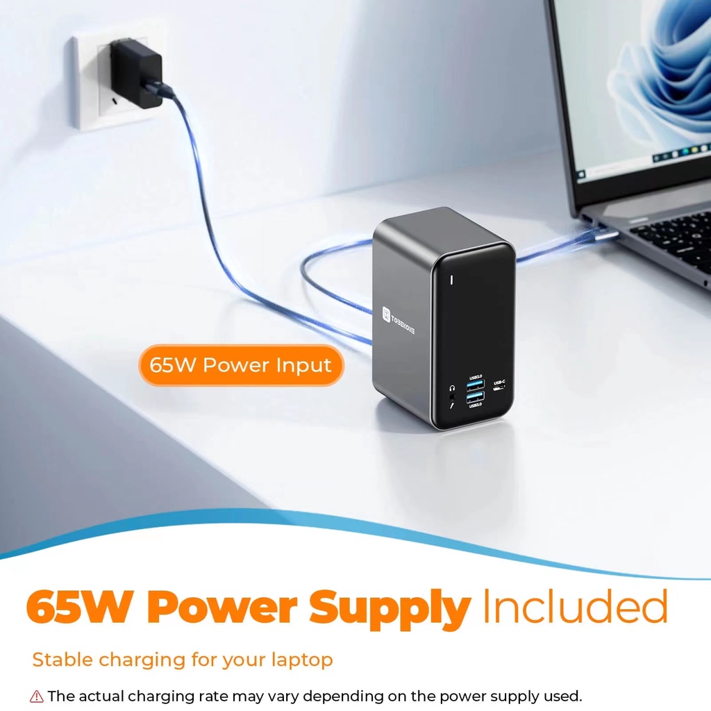 65W Power Supply Included: The 65W power brick coming with the dock stably supplies power to both the dock and your laptop. Instead of having to plug your laptop's power supply into your laptop, you can keep your laptop charged while using all your external devices. The PD 3.0 port of the dock is capable of passing through close to 85 watts when used with a 100-watt power supply and power cord.