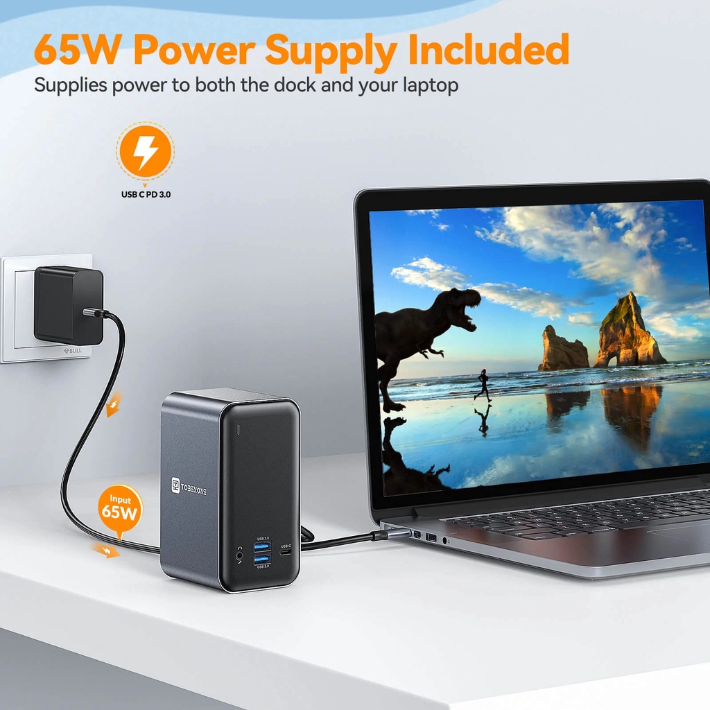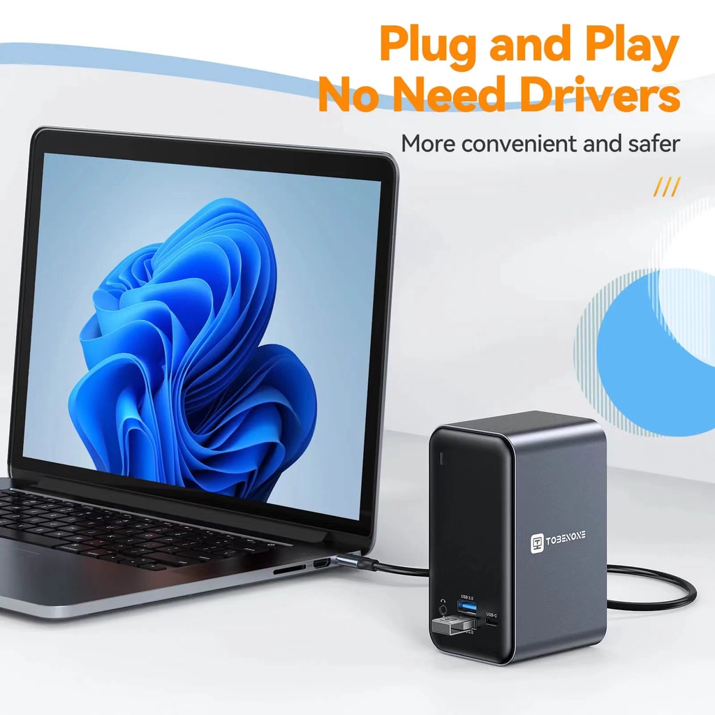FAST and STABLE power delivery and Ethernet: Tobenone USB C dock is equipped with one USB C PD3.0 that supports 100W laptop charging passthrough, keeping charging your laptop and peripheral devices. This dual monitor dock goes with a 65W power supply which helps the dock run more stably. The USB C dock is equipped with an RJ45 Gigabit Ethernet port and supports a stable network speed up to 1 Gbps and auto 10/100/1000Mbps.