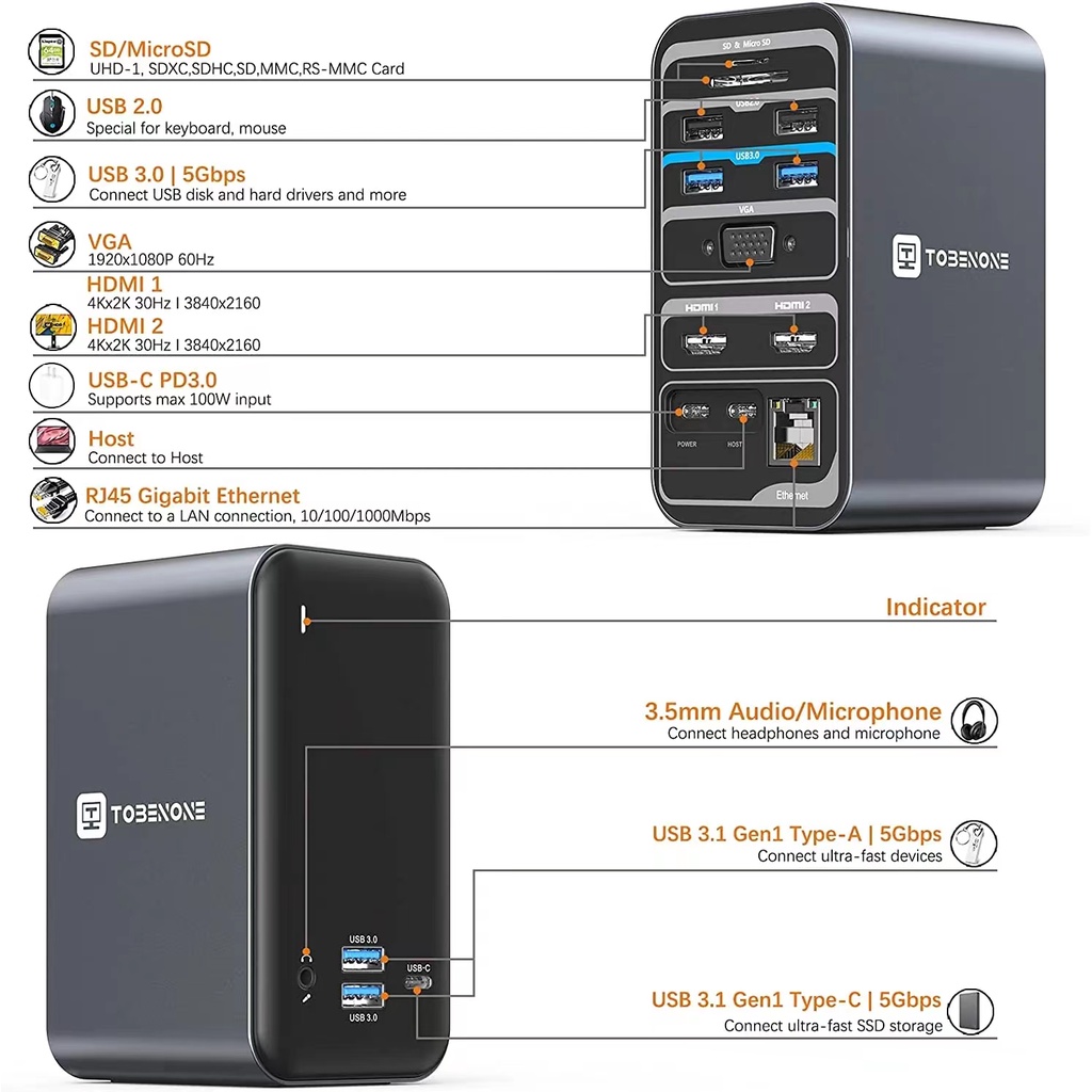 15 in 1 USB-C laptop docking station: Tobenone laptop docking station dual monitors allow you to extend dual monitor via HDMI ports OR VGA ports, transfer data via 4×USB 3.0 or 1×USB C port(5Gpbs), USB C PD 3.0, 2×USB 2.0 for wireless devices such as keyboard or mouse, 3.5mm Audio, SD/TF reader and RJ45 Gigabit Ethernet. Plug and play, no driver needed.65W power supply included.
