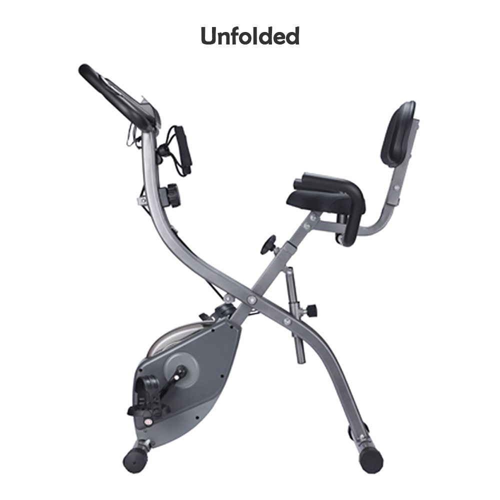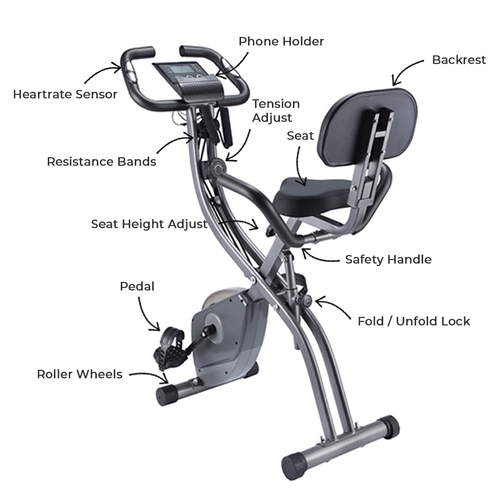 The X3 stationery exercise bike is a unique and innovative 3-in-1 exercise bike. The exercise bike can be switch from folded mode to upright and recumbent position for different users and exercises – without needing a few different fitness equipment. It provides a full body workout with its resistance bands for the arms and cycling functions for the legs.