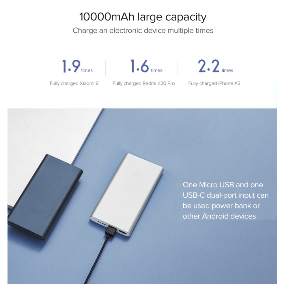 Micro-USB + USB-C two input ports, support 18W fast input, fully charge itself in 4 hours